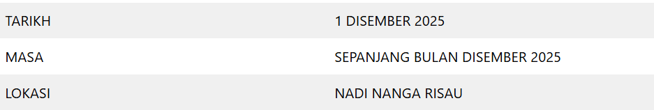 Utama > Maklumat Komuniti > JADUAL BULANAN NADI (DISEMBER) Jadual Perkhidmatan Pintar NADI Nanga Risau bagi Bulan Disember. Jangan lepaskan peluang dan belajar bersama NADI.